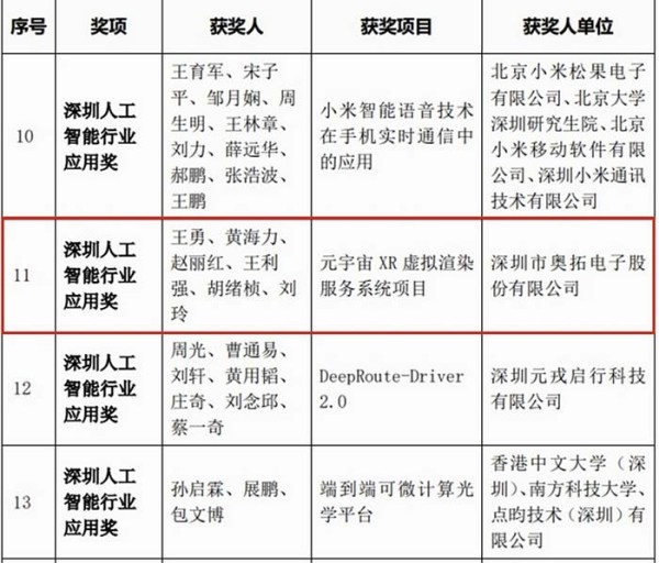 與奧拓電子一并獲得本屆“深圳人工智能獎”系列獎的還有清華大學、北京大學、平安科技、商湯科技、鵬城實驗室等著名高校、優秀企業、國家級人工智能研發平臺。