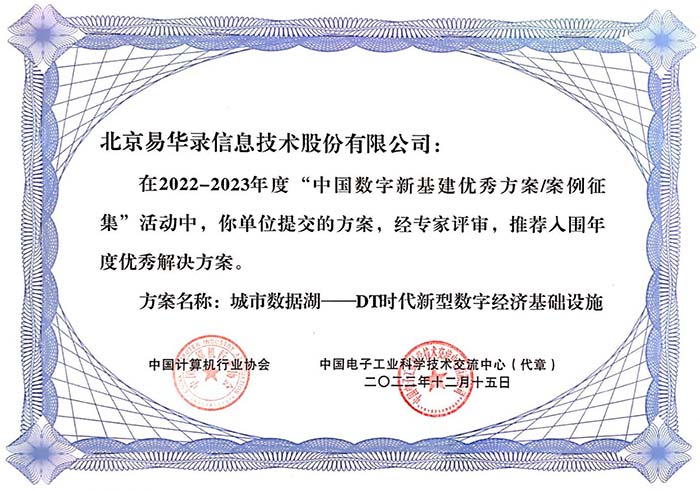 近期,在中國計(jì)算機(jī)行業(yè)協(xié)會和中國電子工業(yè)科學(xué)技術(shù)交流中心聯(lián)合舉辦的2022-2023年度“中國數(shù)字新基建優(yōu)秀方案/案例征集”活動中,易華錄《城市數(shù)據(jù)湖——DT時代新型數(shù)字經(jīng)濟(jì)基礎(chǔ)設(shè)施》方案成功入選中國數(shù)字新基建年度優(yōu)秀解決方案。