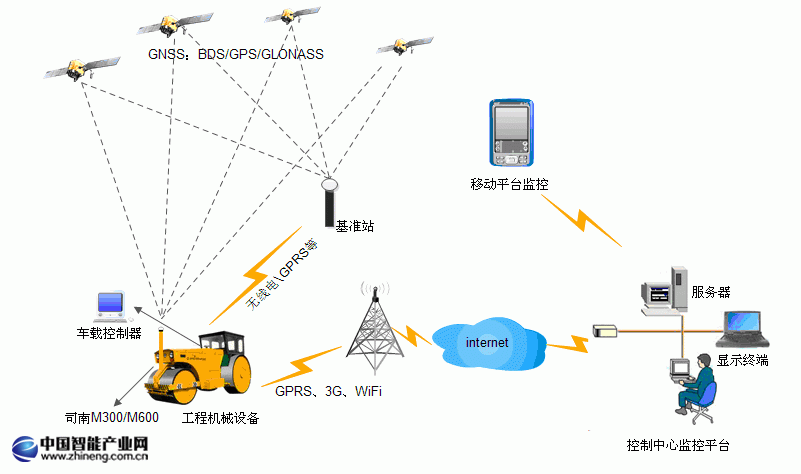 使用北斗等GNSS多星系統聯合高精度定位,可以把衛星定位的三維坐標實時的輸入機載計算機,自動生成三維數字模型,機載計算機實時比較工程機械作業端的當前位置和設計數據,并輸出校正控制信號及控制設備,對機械的作業端進行控制,主要施工機械只需要1-2次往返施工,即可達到設計位置,這種以絕對坐標X、Y、Z為基準的全新控制方式,摒棄了測量、打樁、放樣等傳統工序,一次性解決高程控制、平整度控制、坡度控制等等問題,節省了大量的現場測量工作,把工程機械操作手從繁重的整平工作中解放出來,使他可以專注于駕駛,大量提高了施工現場的工作效率及安全性,同時也可以將數據傳遞到控制中心進行質量控制。系統組成示意圖如下:
