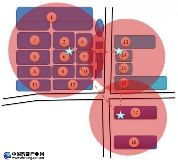 1、上圖中6號、14號、17號廠房的“★”代表三射頻工業無線AP EKI-6340-3。(詳細資料見附帶產品資料)